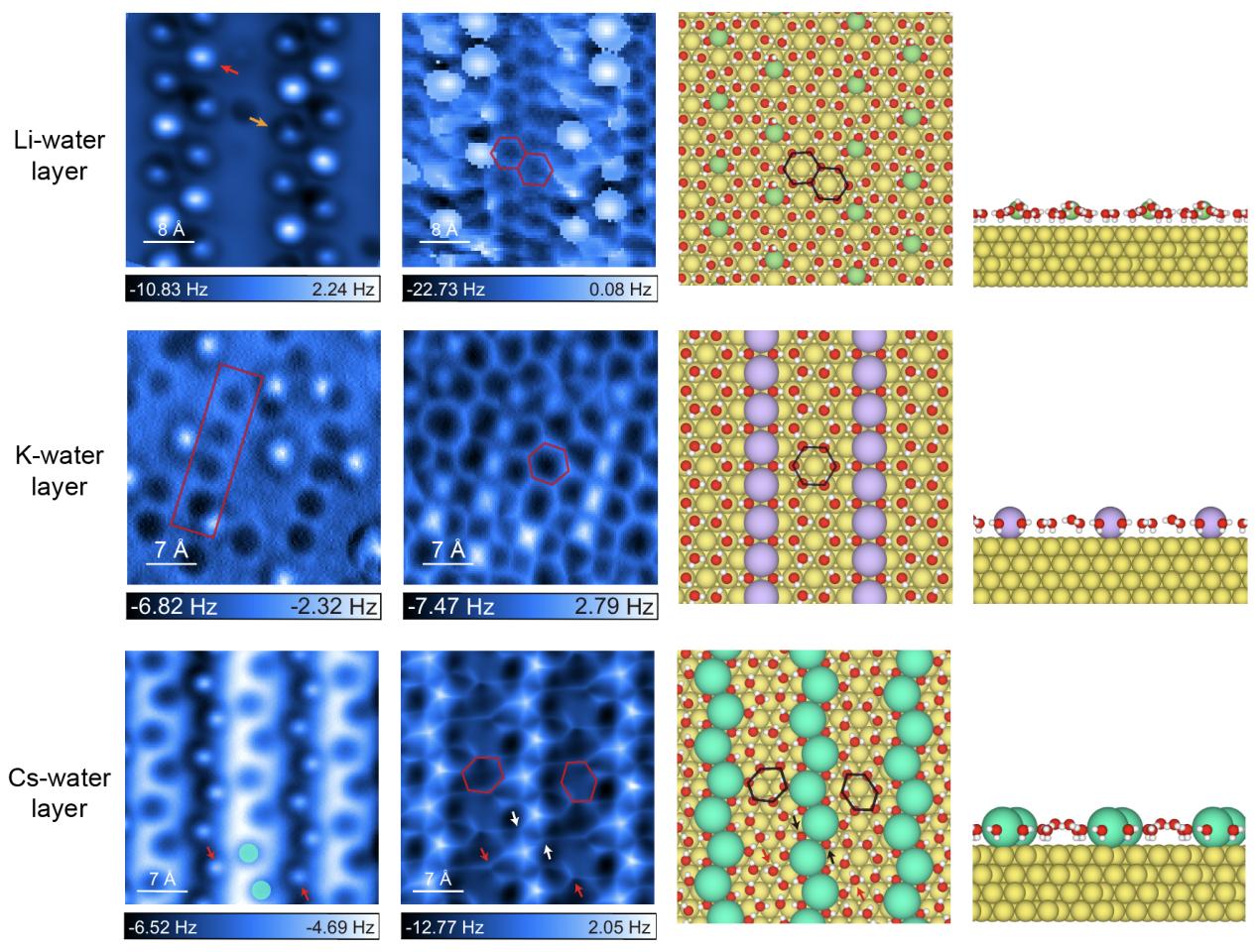 为了研究带电金属电极表面上水分子与离子之间的相互作用,研究人员在Au(111)表面沉积了碱金属原子与水分子。碱金属原子与Au衬底会发生电荷转移形成碱金属离子,并使得衬底带负电。进一步碱金属离子与水分子形成网络,这构成了理解溶液/电极界面原子结构的模型系统。研究人员进行了锂、钾、铯三种碱金属离子的研究,发现随着碱金属离子半径的增大,其第一水合壳层中的水分子数目依次增多。此外,碱金属离子与衬底之间的距离则依次减小,锂离子可以浮于水分子的上方,而钾离子与铯离子倾向于排开水分子直接与衬底接触,这可能在电化学反应中产生阻塞效应(blocking effect)。更进一步,高分辨AFM的实验发现碱金属离子对于水分子氢键网络的有序度具有不同的影响。锂离子倾向于促进水分子氢键网络的有序(Structure maker),铯离子则会使得水分子的氢键网络产生明显形变(Structure breaker),而钾离子的作用介于二者中间。