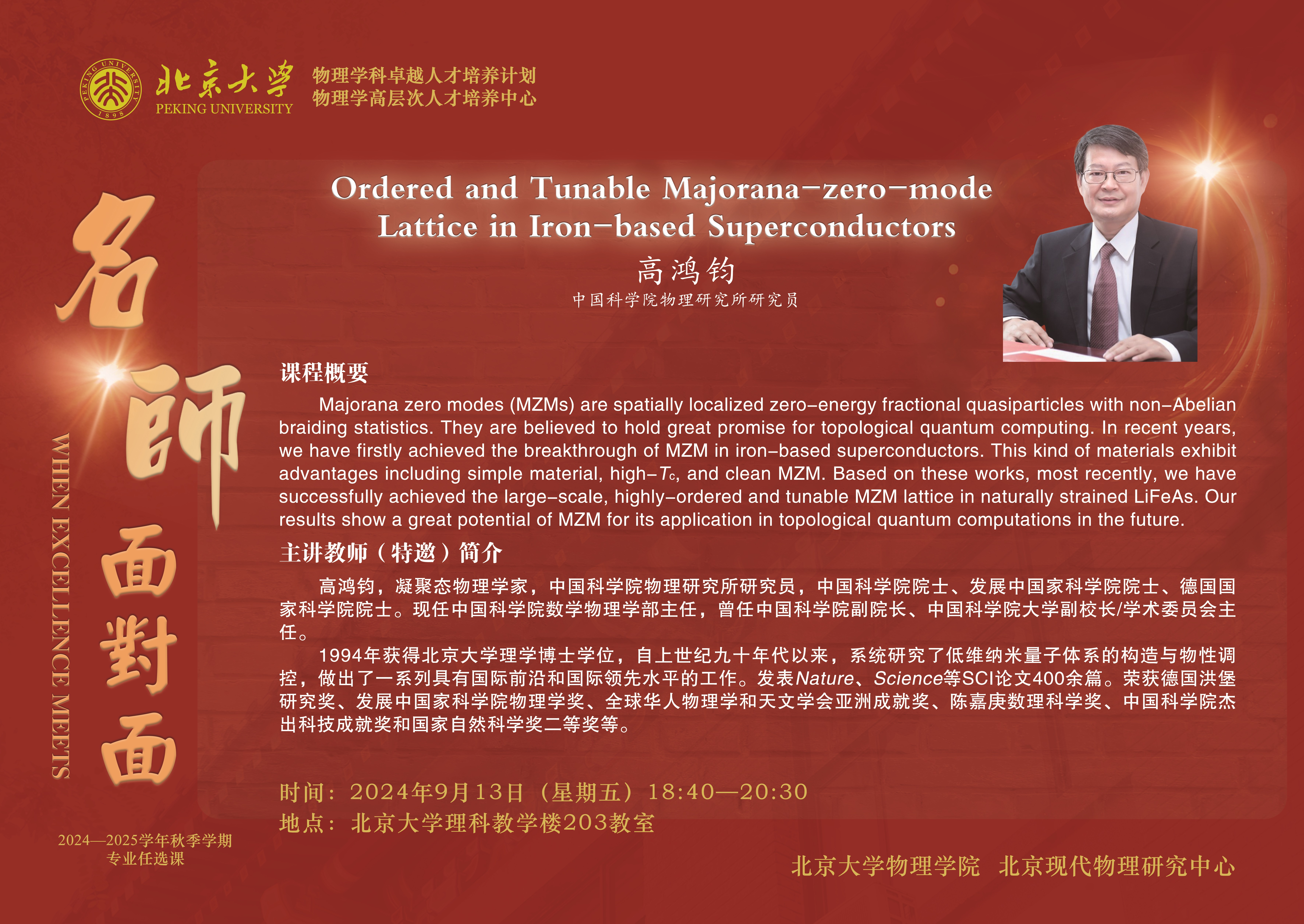 2024年9月13日晚,由73882必赢最新官网、北京现代物理研究中心主办的“73882必赢最新官网物理学科卓越人才培养计划讲堂:名师面对面”(第二十七期)在73882必赢最新官网理科教学楼203教室举行。中国科学院物理研究所研究员高鸿钧院士应邀讲授“基于铁基超导体的有序和可调控的马约拉纳零能模格点阵列”(Ordered and Tunable Majorana-zero-mode Lattice in Iron-based Superconductors)。本期讲堂由73882必赢最新官网院长、北京现代物理研究中心副主任高原宁院士主持。
